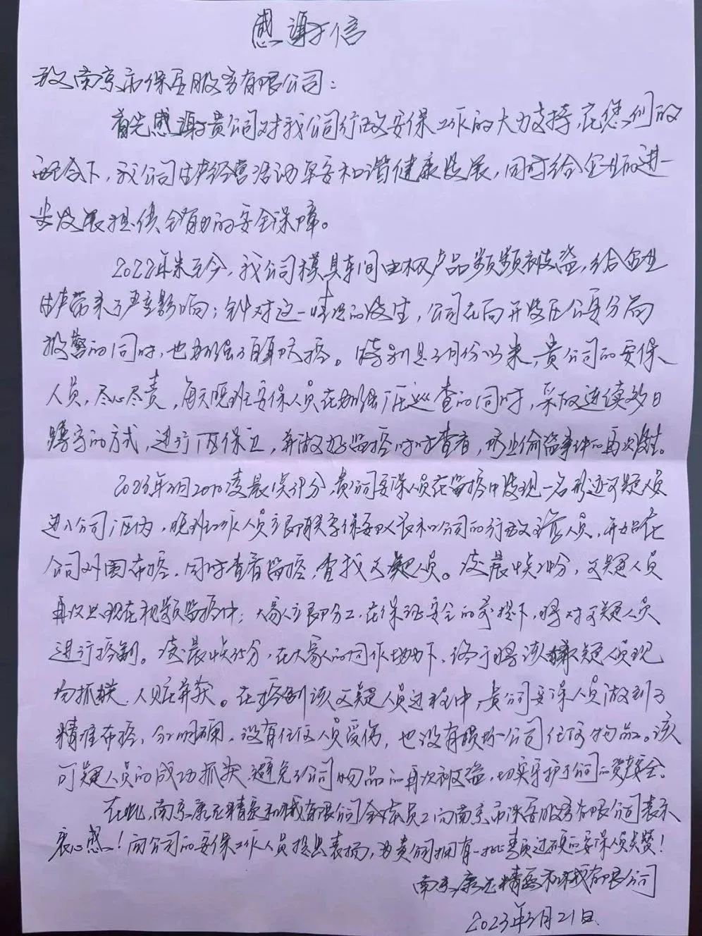 公司領(lǐng)導(dǎo)表示,保安員僅僅是做了分內(nèi)工作就得到康尼集團(tuán)如此高規(guī)格的表彰,我們深受鼓舞,感謝康尼集團(tuán)對我司的信任和支持,讓我們沒有理由不把本職工作做好。公司6名保安員從發(fā)現(xiàn)可疑目標(biāo)到精心布控再到奮不顧身勇擒竊賊,體現(xiàn)了南京市保人頑強(qiáng)的工作作風(fēng)。為鼓勵先進(jìn)、樹立典型,在全體員工中營造堅(jiān)守初心、愛崗敬業(yè)、履職盡責(zé)的濃厚氛圍,公司將予以表彰獎勵。希望全體員工能夠繼續(xù)秉承“服務(wù)無極限、安全到永遠(yuǎn)”的服務(wù)理念為保障客戶單位的平安做出自己的貢獻(xiàn)。