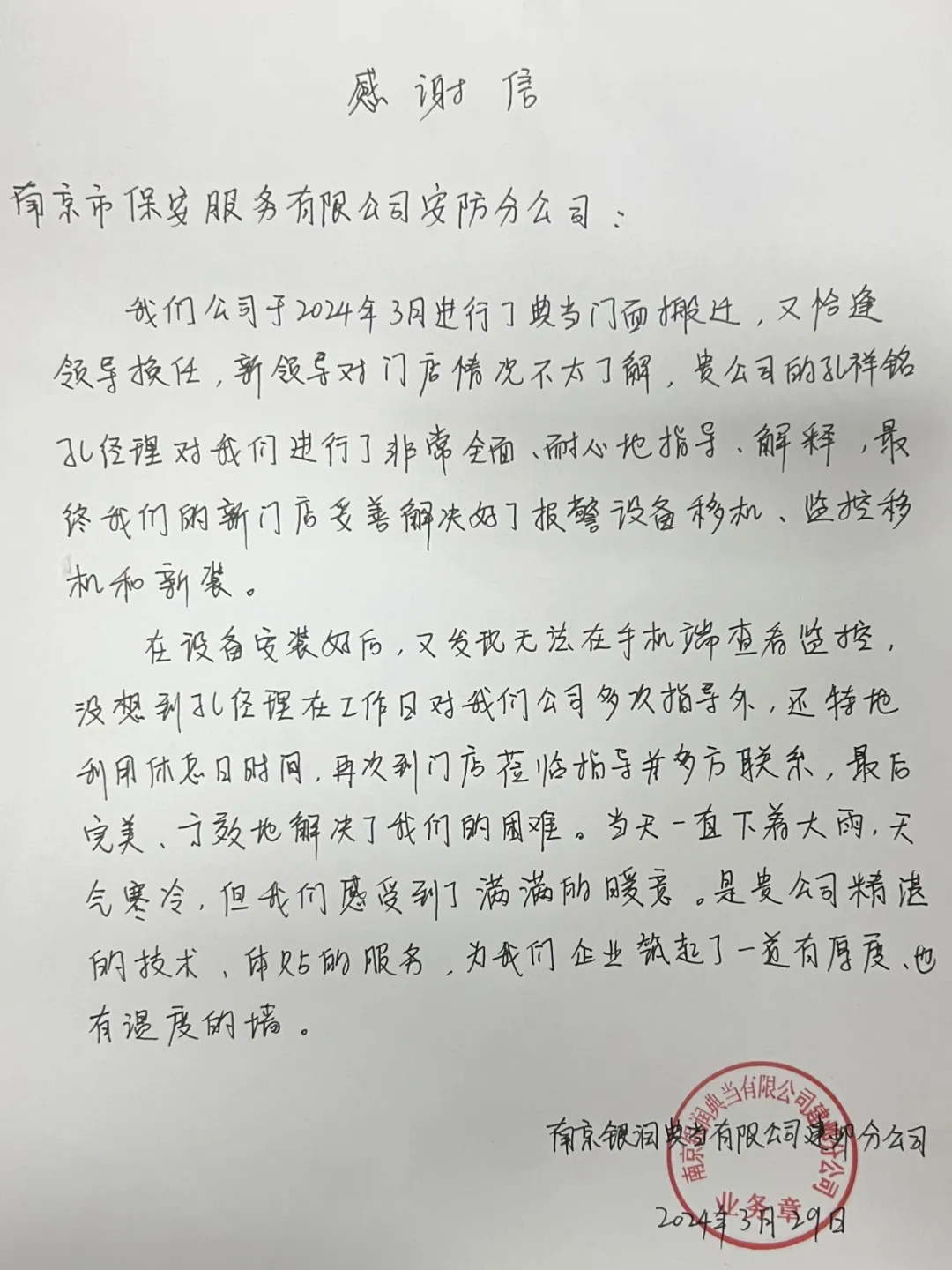 近日,南京市保安服務(wù)有限公司收到了一封來自南京銀潤典當(dāng)有限公司建鄴分公司發(fā)來的感謝信,信中飽含著對公司安防部經(jīng)理孔祥銘及其安防團(tuán)隊(duì)的肯定和感謝。